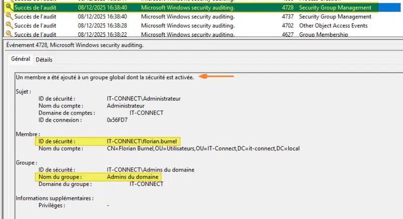 Quelques secondes auparavant, un autre événement tout aussi intéressant a été créé. Associé à l'ID 4728, il précise : Un membre a été ajouté à un groupe global dont la sécurité est activé. Là encore, cet événement permet de voir l'action réalisée.