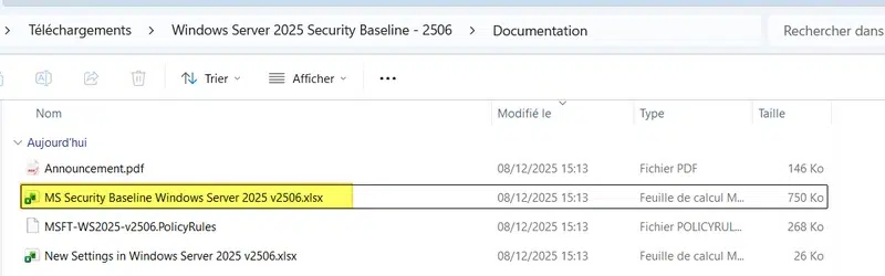 Je vous invite à utiliser le lien ci-dessous vers le Microsoft Security Compliance Toolkit 1.0 pour télécharger l'élément nommé "Windows Server 2025 Security Baseline - 2506.zip". Il y a aussi un kit équivalent pour Windows Server 2022, si vous préférez.