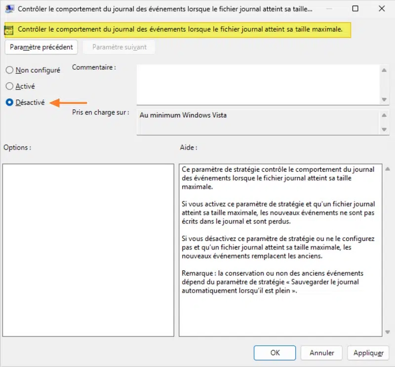 Vous devez aussi désactiver le paramètre suivant : "Contrôler le comportement du journal des événements lorsque le fichier journal atteint sa taille maximale.". C'est important, car ce paramètre assure que les nouveaux événements remplaceront les anciens si le journal est plein. Si la journalisation est bloquée, cela peut être un vrai problème si vous devez réaliser une analyse.