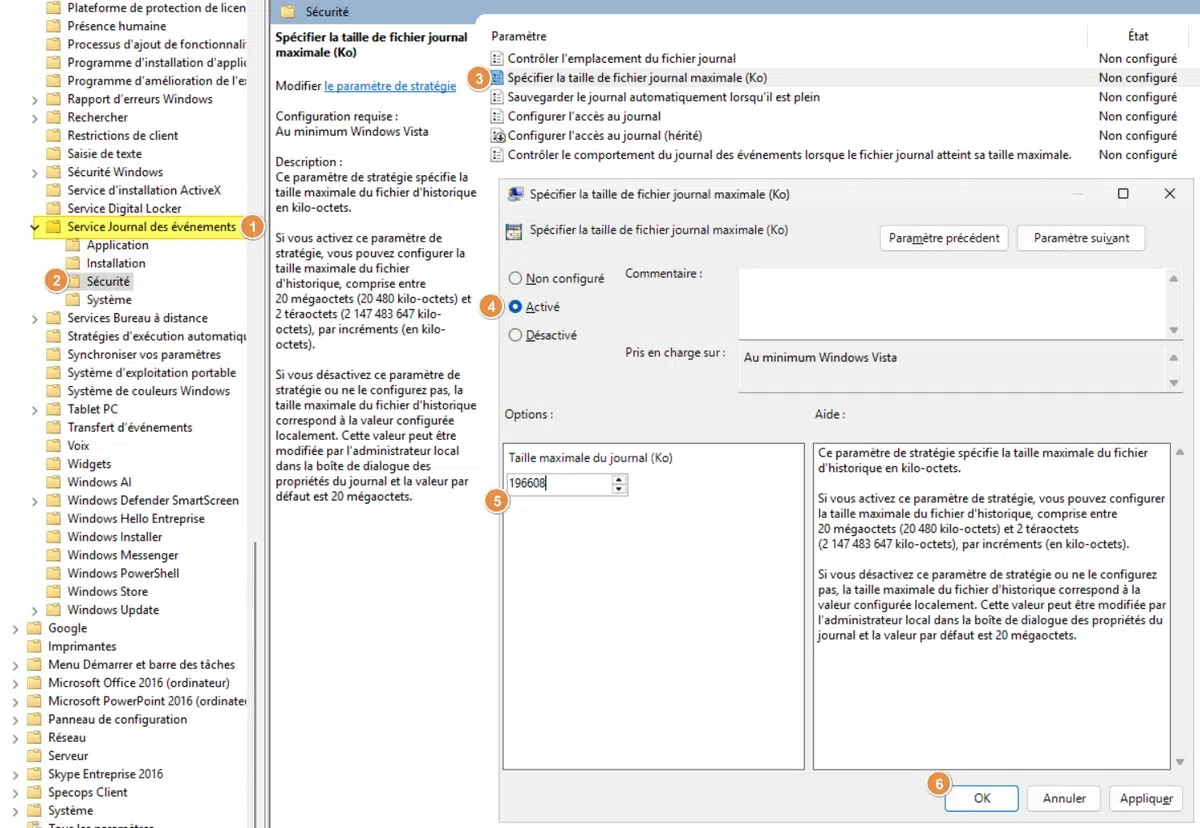 Vous avez ensuite une sous-section pour chaque journal. Par exemple, pour modifier la taille du journal "Sécurité", éditez le paramètre "Spécifier la taille de fichier journal maximale (Ko)" sous "Sécurité" afin de l'activer. Spécifiez la valeur 196 608 Ko, soit 196 Mo.