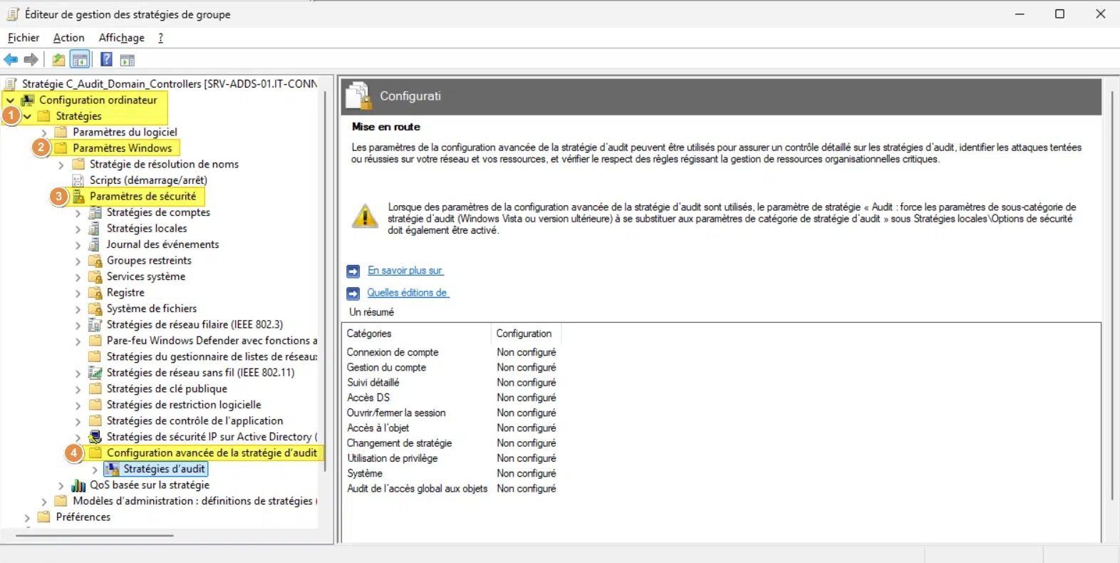 - Configuration ordinateur > Stratégies > Paramètres Windows > Paramètres de sécurité > Configuration avancée de la stratégie d'audit.