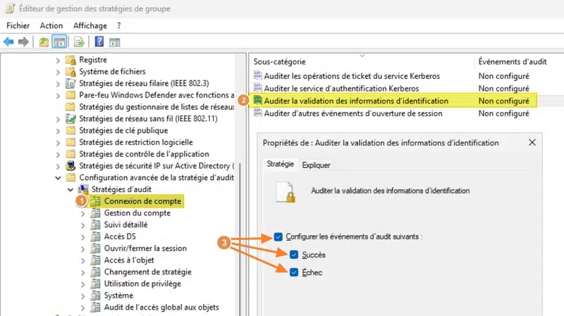 Cliquez sur "Connexion de compte", puis sur le paramètre "Auditer la validation des informations d'identification". Conformément aux bonnes pratiques de Microsoft, configurez ce paramètre. Vous devez cocher les trois cases. Parfois, il ne faudra cocher que "Succès" ou "Échec" selon les besoins.