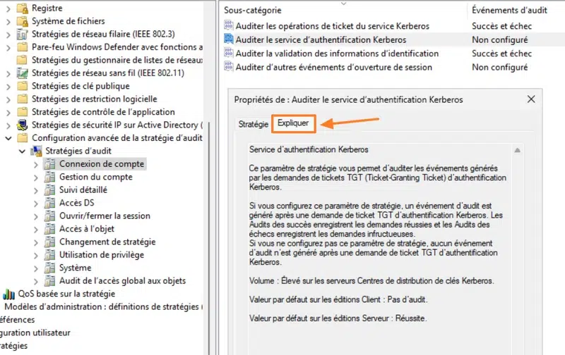 | Connexion de compte | Auditer le service d'authentification Kerberos | Échec | |