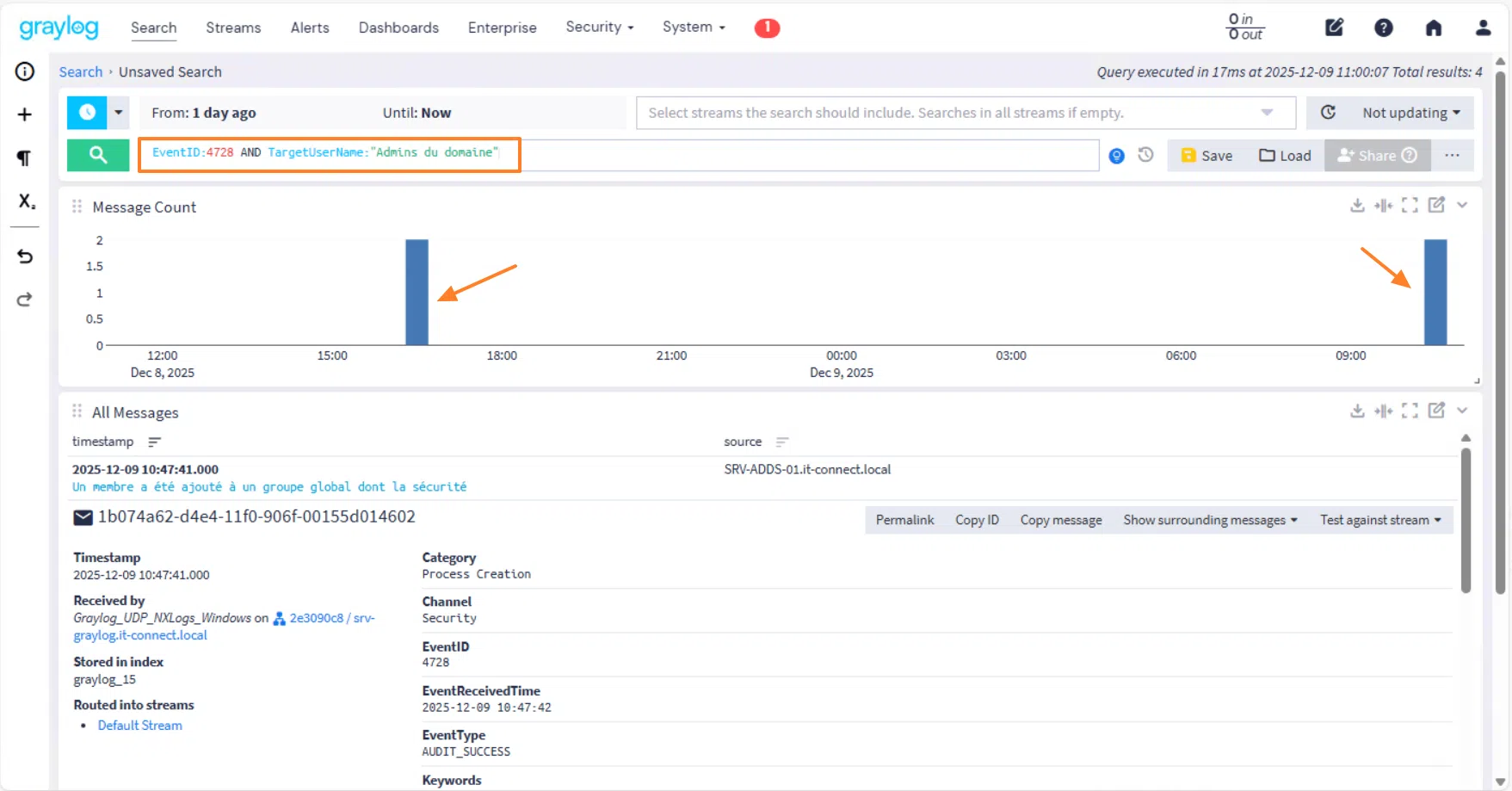 Je vous recommande vivement de centraliser les journaux dans un outil adapté et capable de les stocker et de les analyser (ELK, Graylog, etc.). Ci-dessous, vous avez un exemple d'une requête Graylog permettant d'identifier les événements suivants : Ajout d'un utilisateur au groupe "Admins du domaine".