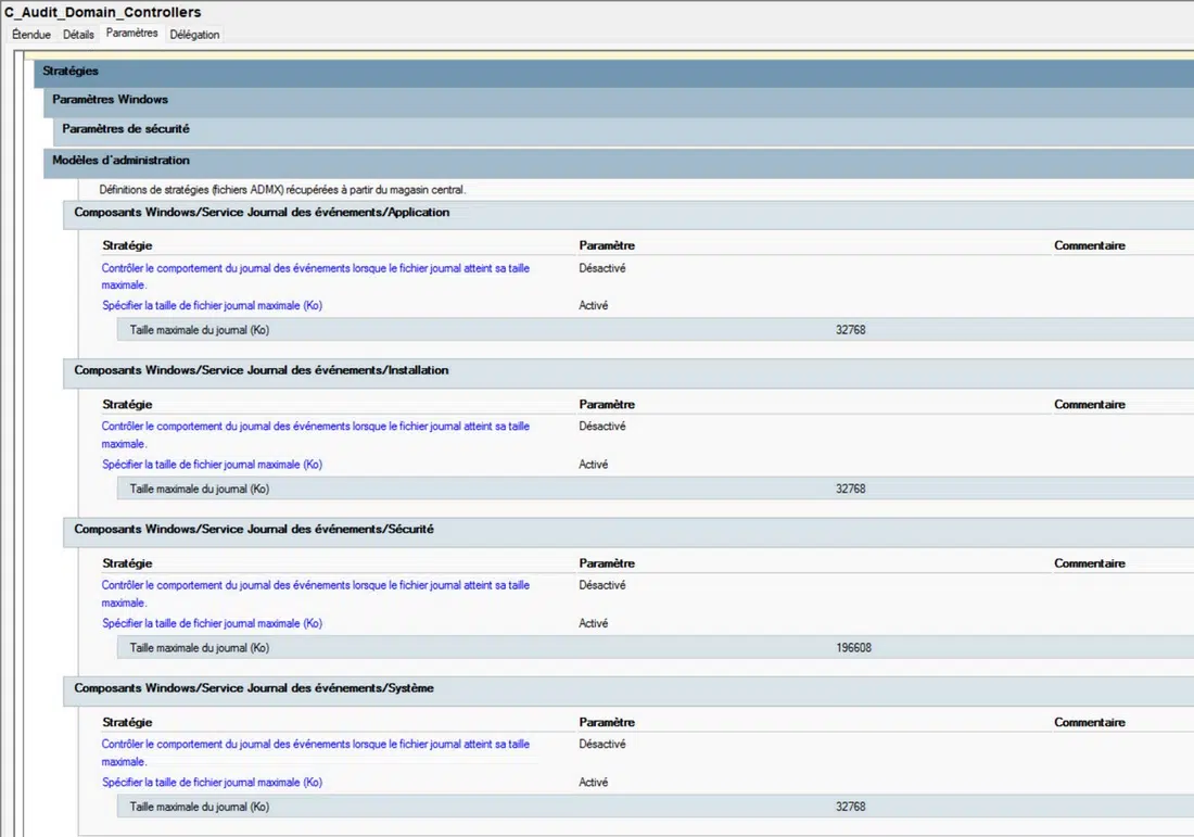 Vous pouvez modifier la stratégie d'audit créée précédemment ou créer une nouvelle GPO dédiée à la configuration des journaux. Les paramètres se situent ici :