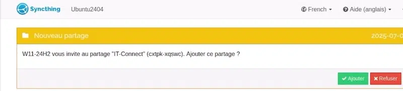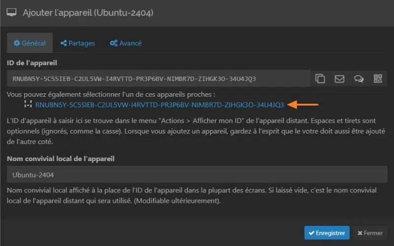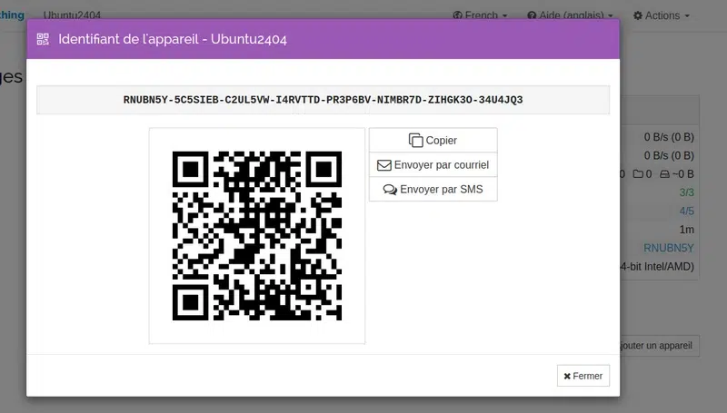 Comment obtenir l'ID ? Sur chaque interface web Syncthing, allez dans "Actions" (en haut à droite) puis "Afficher mon ID". L'image ci-dessous montre l'ID de la machine Ubuntu2404 : il suffit de le saisir sur l'instance Windows pour initier une connexion.