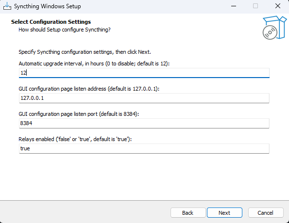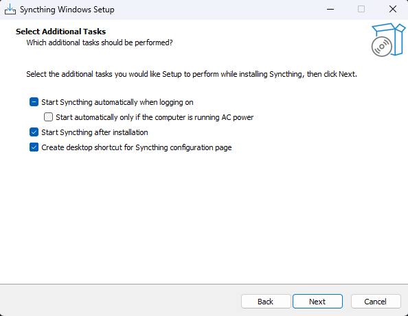 Sur le principe, exécutez le fichier téléchargé. Suivez les étapes de l'assistant d'installation. Il est à noter que Syncthing s'installe dans le profil de l'utilisateur.
