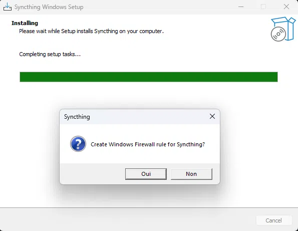 Dernière action à valider : la création de règles de pare-feu pour autoriser les flux Syncthing. Il est à noter que ces règles ne font pas un filtrage strict sur le port, mais elles autorisent tous les flux en TCP/UDP à destination de syncthing.exe. Vous pouvez affiner pour limiter au port TCP/22000 sur les flux entrants.