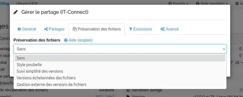 Syncthing propose différentes stratégies de gestion de versions pour les fichiers supprimés ou modifiés, permettant de récupérer des versions antérieures. Accédez à ces options dans l'onglet "Préservation des fichiers" dans les propriétés d'un partage. De la corbeille simple aux versions horodatées ou progressives (capture à intervalles réguliers), plusieurs stratégies sont offertes.