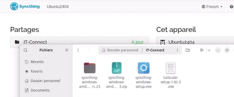 À ce stade, les deux dossiers devraient commencer à se synchroniser. Les modifications apportées à l'un des dossiers seront répliquées sur l'autre : ajout, modification et suppression. D'ailleurs, sur la machine Ubuntu, les fichiers déposés sur la machine Windows dans le dossier partagé sont déjà là !