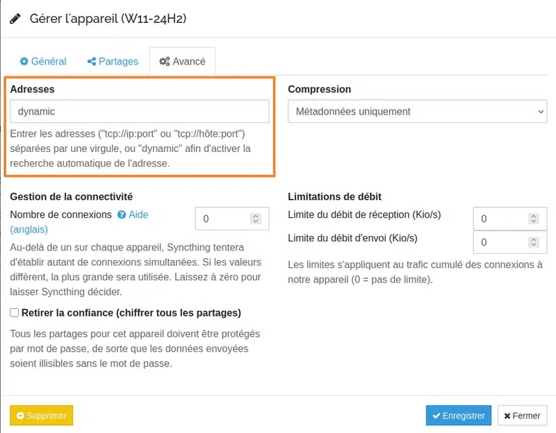 Vous avez aussi la possibilité de définir l'adresse pour joindre une instance Syncthing. Par défaut, c'est en dynamic donc Syncthing ne va pas se référer à l'adresse IP du client : si elle change, la connexion sera maintenue. Ce comportement peut être adapté dans les paramètres, en remplaçant dynamic par une information statique, en suivant le format tcp://ip:port. Par exemple : tcp://192.168.14.120:22000.