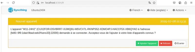 La machine est déclarée, mais pour autant, la connexion n'est pas établie : il faut approuver cette demande. Sur l'interface Syncthing de la machine Ubuntu, cette demande apparaît sous la forme d'une notification "Nouvel appareil". Validez avec le bouton "Ajouter l'appareil".