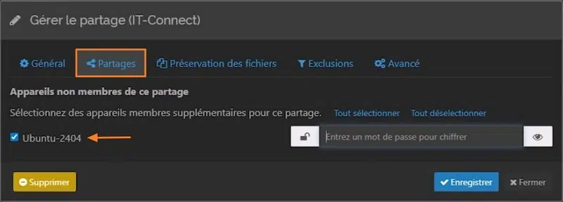À partir de l'onglet "Partages", sélectionnez le client à ajouter. N'indiquez pas de mot de passe pour chiffrer : c'est tentant, mais si vous faites ça, la machine distante pourra seulement recevoir des données chiffrées. Si vous souhaitez que ce soit bidirectionnel, ne cochez pas l'option. Validez.