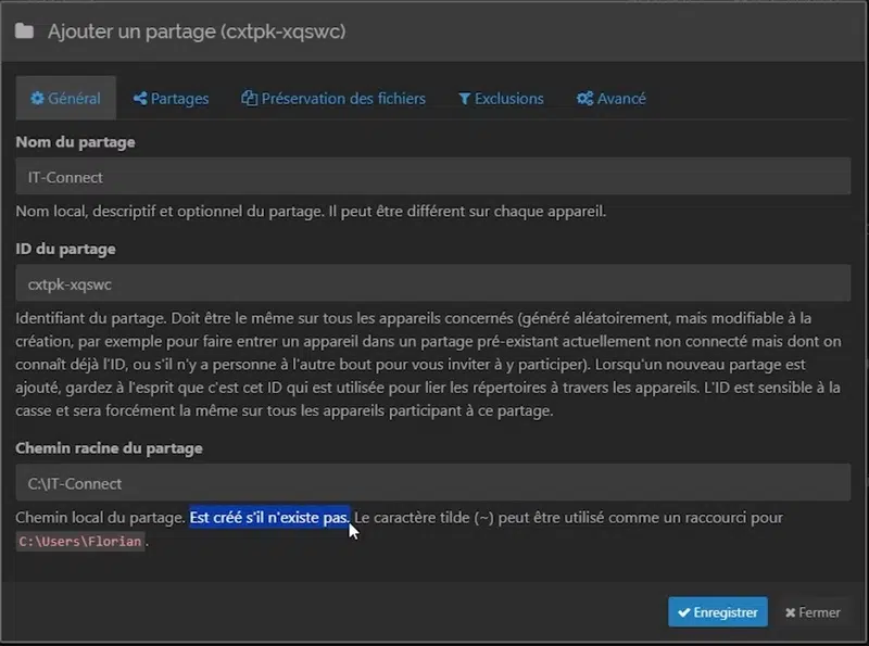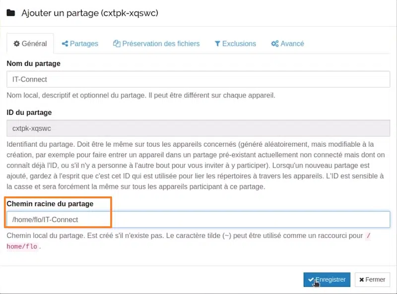 Au-delà du nom, vous devez surtout indiquer le chemin racine du partage : sur la machine locale, où synchroniser les données de ce partage. Ici, nous pouvons indiquer /home/flo/IT-Connect. Donc, le répertoire C:\IT-Connect de la machine Windows sera synchronisé avec le répertoire /home/flo/IT-Connect de la machine Linux. Validez.