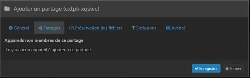 L'onglet "Partages" met en évidence qu'aucun autre appareil n'a accès à ce partage. Ce qui est logique puisque nous sommes en train de le créer...