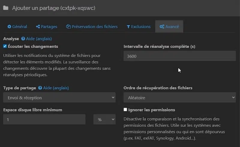 L'option "Écouter les changements" est intéressante : Syncthing va surveiller l'activité du système de fichiers pour détecter les changements de données. Ceci promet une synchronisation réactive et automatique entre les appareils en cas de changement. En complément, une analyse complète est effectuée toutes les heures (3600 secondes).