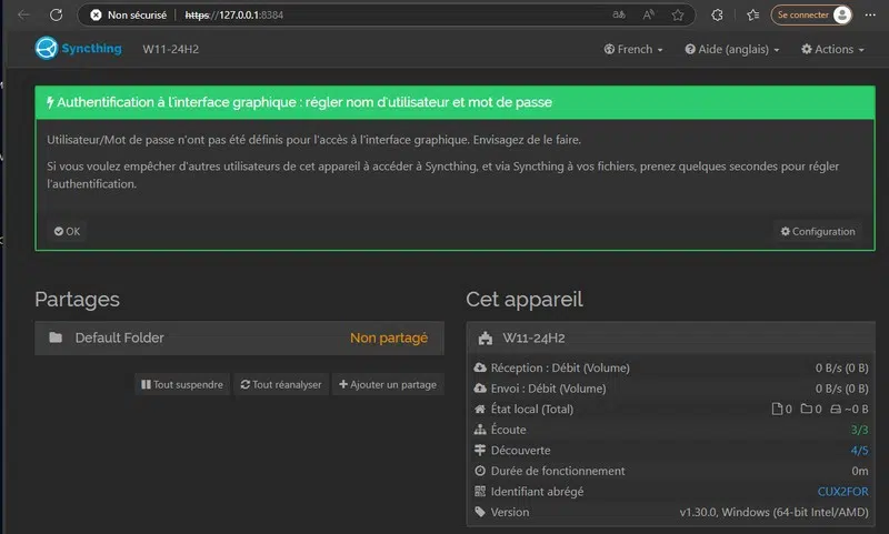 À partir d'un navigateur web, vous pouvez accéder à l'interface web de Syncthing, via https://localhost:8384. Même punition que sur Windows : vous devez définir un mot de passe.