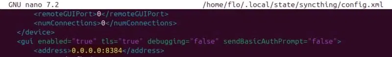 Dans le cas où votre machine Linux n'a pas d'interface graphique, vous êtes bloqué : vous ne pouvez pas vous connecter depuis une autre machine, puisque ce n'est pas autorisé par Syncthing par défaut. Dans ce cas, vous devez éditer le fichier de configuration (attention au nom d'utilisateur dans le chemin) :