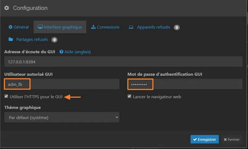 Localisez la section <gui> et modifiez l'adresse 127.0.0.1:8384 par 0.0.0.0:8384 ou l'adresse IP de votre machine (si elle est statique). Vous pouvez aussi passer l'option tls="true" pour activer le HTTPS par défaut sur l'interface web.