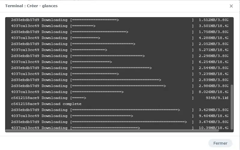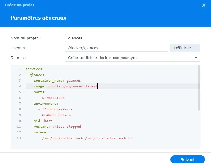 Lancez la création du projet. L'image Glances sera téléchargée et le conteneur créé dans la foulée.