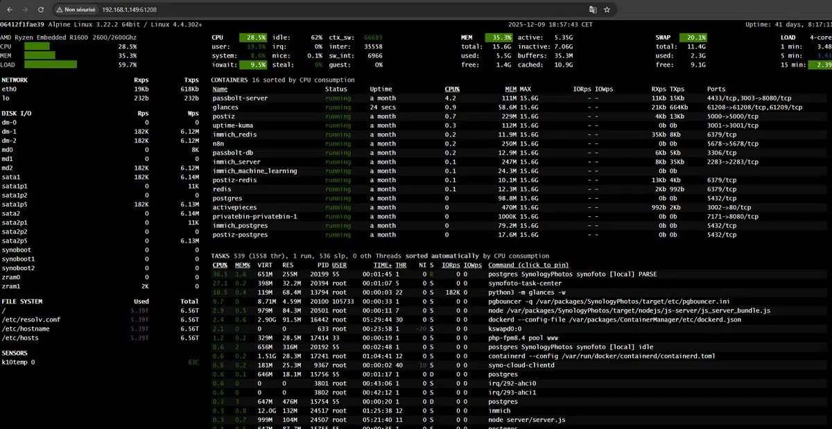 Si vous souhaitez jeter un coup d'œil aux performances de votre NAS ou identifier la cause d'un ralentissement (quel service ou quel conteneur consomme trop de ressources), Glances est une solution pratique. La vue d'ensemble permet de gagner du temps, plutôt que de naviguer dans différentes consoles de DSM ou de basculer via la ligne de commande (pour exécuter top, par exemple).