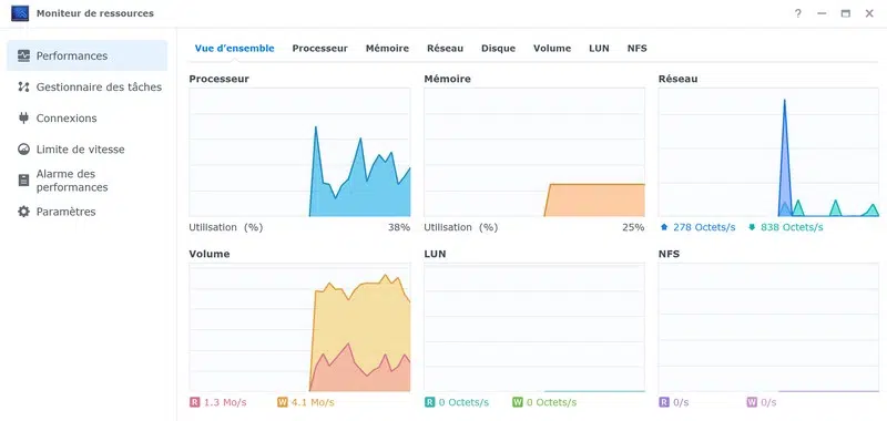 La partie dédiée au stockage (tout à gauche) est un peu plus difficile à analyser car elle montre beaucoup de volumes différents (ce qui doit refléter la structure de DSM).