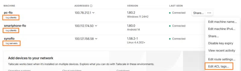 Il faut ensuite ajouter le bon tag sur chaque machine à partir de l'onglet "Machines". Une option "Edit ACL tags..." est présente sur chaque machine.
