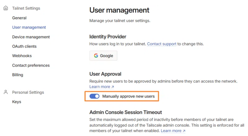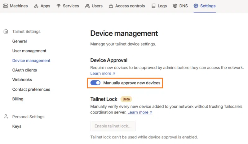 Descendez dans la section "Device management" et cochez l'option "Manually approve new devices" pour avoir le même comportement avec les appareils. La fonctionnalité "Tailnet Lock", encore en Beta, est décrite sur cette page.