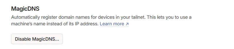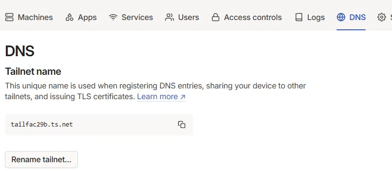 - DNS : les paramètres DNS, et la gestion du nom du réseau Tailnet