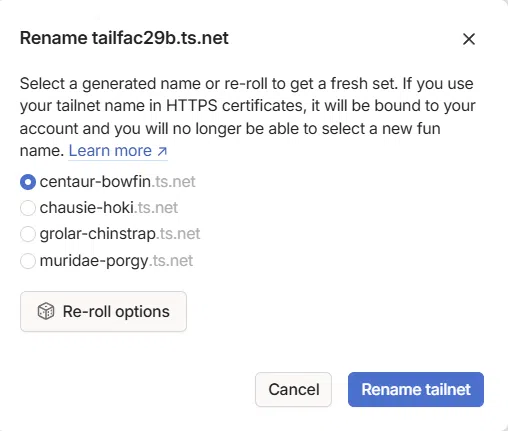 Plusieurs noms vous seront proposés. Choisissez celui qui vous convient puis validez. Si vous souhaitez d'autres noms, cliquez de nouveau sur "Re-roll options". Il est préférable de le faire dès le début et de ne pas y revenir. L'idée étant de choisir sur un nom qu'il sera plus facile de mémoriser. Ici, ce sera centaur-bowfin.ts.net, pour ma part. Il faut savoir, que par défaut, Tailscale distribue son propre DNS sur les machines clientes, ce qui permet la résolution de noms avec les appareils du réseau VPN Mesh.