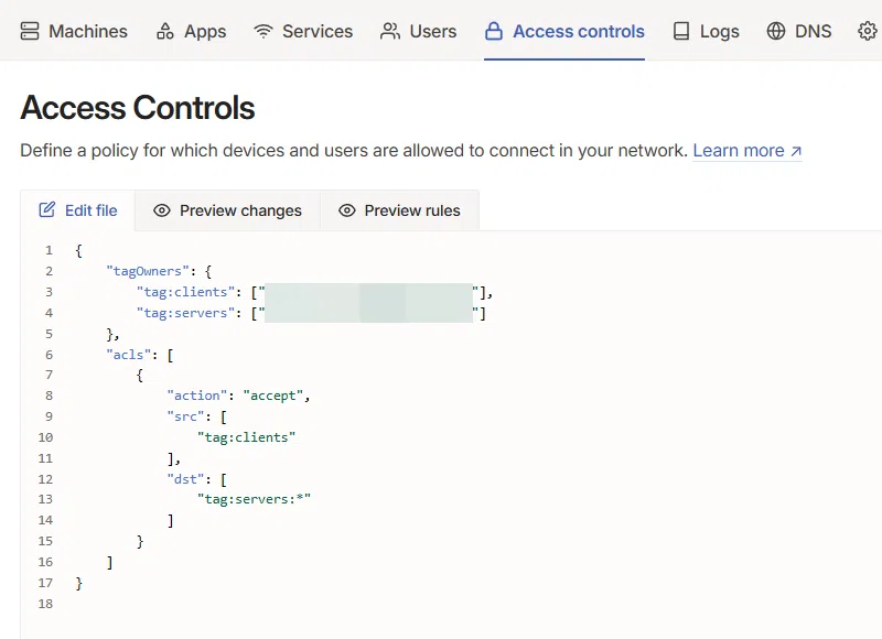 - Refus par défaut : une politique de refus par défaut empêche toute communication entre les appareils, sauf si un accès explicite est défini. Toutefois, si la section ACLs est absente du fichier de configuration de la politique Tailnet, Tailscale applique par défaut une politique autorisant toutes les connexions.