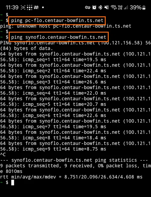 Cela est notamment possible grâce à la fonctionnalité de MagicDNS, activée par défaut. Grâce à elle, la gestion des enregistrements DNS est automatique et vous pouvez même utiliser les noms courts. Par exemple, la machine "PC-FLO" peut être contactée simplement avec ce nom, sans préciser le nom de domaine complet, à savoir "pc-flo.centaur-bowfin.ts.net".