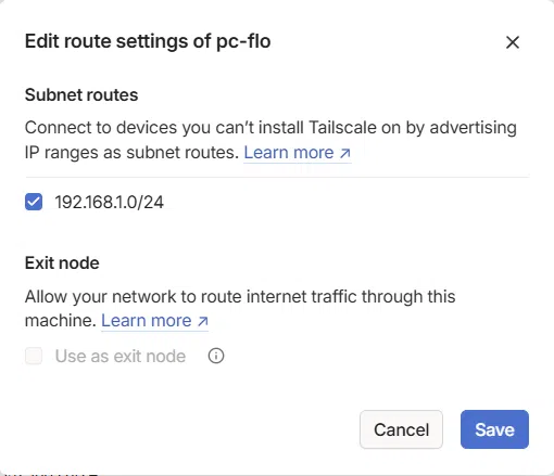 Dans ce cas, il convient d'utiliser la fonction de "Subnet Router" sur l'une de vos machines. Cela va permettre d'autoriser les autres machines à passer par cette machine-là pour accéder à un sous-réseau.