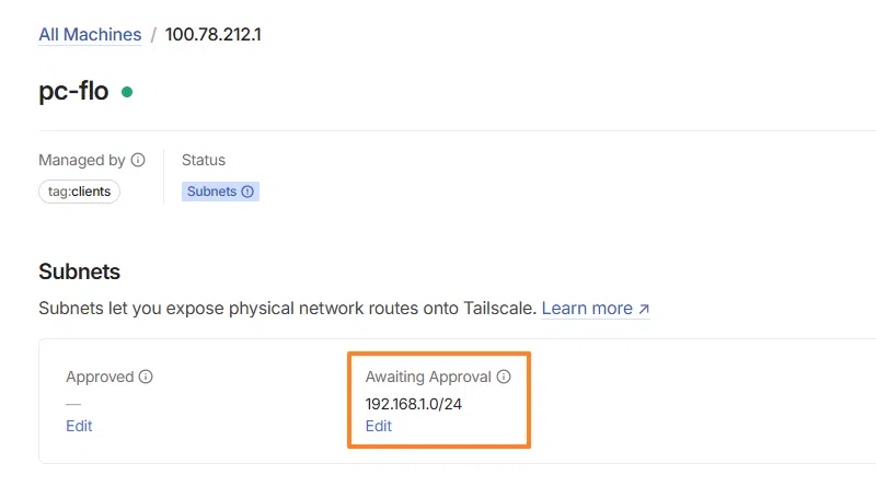 En plus de cette commande, l'administrateur doit accéder à la configuration de l'appareil sur l'interface Tailscale pour approuver la route. Il est nécessaire de cliquer sur "Edit" dans la section "Awaiting Approval".