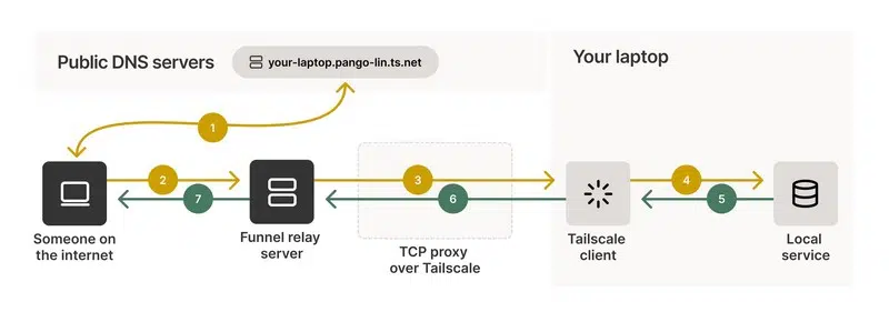 Funnel, c'est le nom d'une fonctionnalité innovante proposée par Tailscale que vous pouvez utiliser pour exposer une ressource locale sur Internet. La ressource sera accessible par l'intermédiaire d'un nom de domaine DNS, correspondant à votre réseau Tailnet. Dans mon cas, cela pourrait donner : mon-app.centaur-bowfin.ts.net.