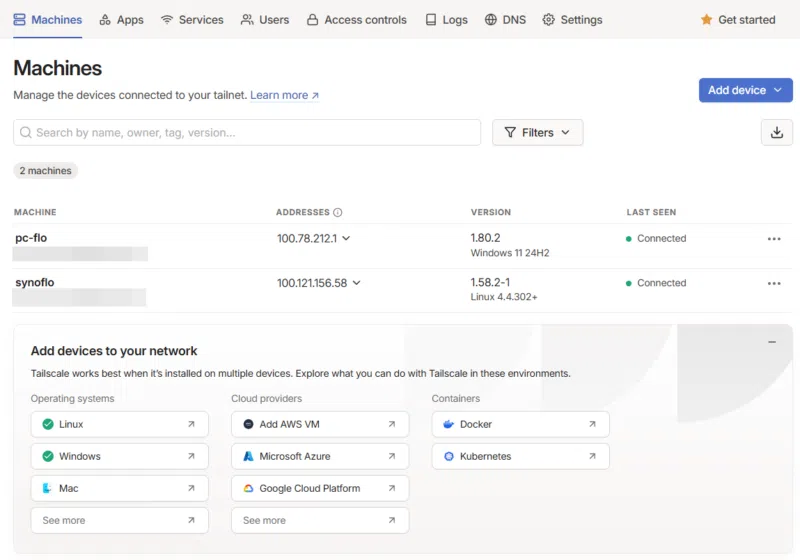 - Machines : vous pouvez visualiser toutes les machines avec un client Tailscale, ainsi que leur état