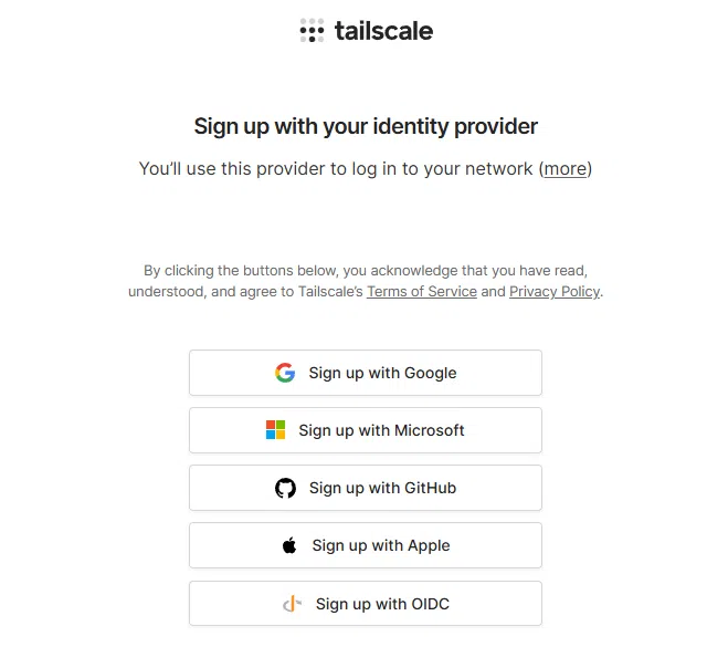 Pour tester Tailscale, vous n'avez besoin que de 2 appareils et de quelques minutes devant vous. Connectez-vous sur cette page pour créer un compte. Vous ne pouvez pas utiliser une adresse e-mail personnalisée, il est obligatoire de s'authentifier via un service tiers : Google, Microsoft, GitHub, etc.