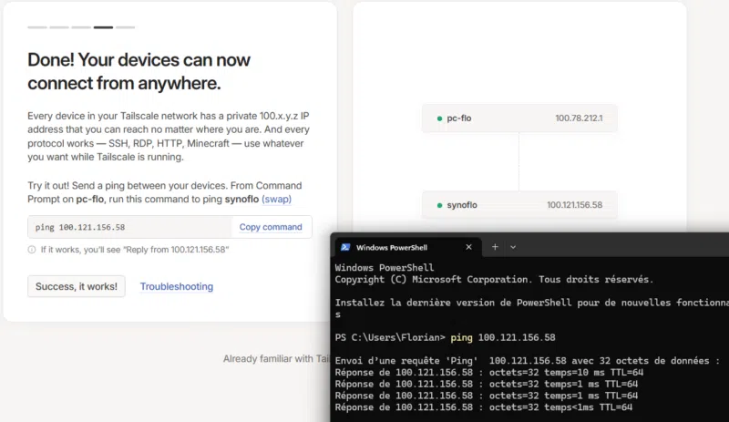 Vous devez alors vous connecter avec votre compte (Google, Microsoft, etc...) pour rattacher l'équipement à votre réseau Tailscale. D'ailleurs, l'appareil est dès à présent visible sur l'interface : il y a donc 2 appareils dans le réseau Tailnet. Comme le suggère l'assistant de mise en route, il est possible de tester un ping entre les deux appareils : nous pouvons voir que cela fonctionne !