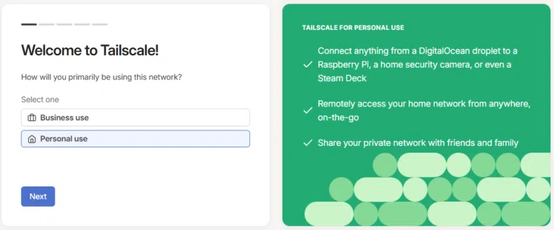 Un assistant est là pour vous guider. Vous devez choisir l'usage que vous ferez de ce Tailnet. Ici, nous partons sur un usage personnel.