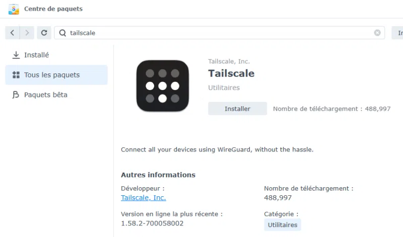 Pour ce second appareil, un NAS Synology sera utilisé : la bonne nouvelle, c'est que le "Centre de paquets" contient un paquet Tailscale prêt à l'emploi ! Il suffit de l'installer. Il a été développé par Tailscale directement et se trouve dans le dépôt officiel de Synology.