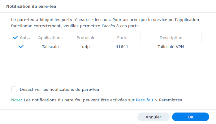 Si vous avez configuré le pare-feu de DSM, veillez à autoriser le port 41641/UDP tel que présenté par la notification déclenchée suite à l'installation du paquet Tailscale. Sinon, créez la règle manuellement.