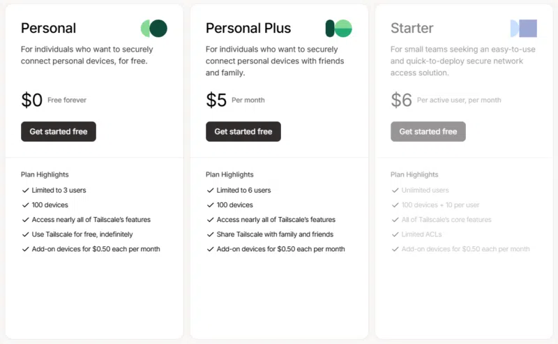 Tailscale est une solution flexible et capable de s'adapter à divers environnements, du HomeLab au réseau d'entreprise. Il y a d'ailleurs une offre gratuite, limitée à 3 utilisateurs et compatible jusqu'à 100 appareils, ce qui est très confortable. Un appareil représente un ordinateur, un smartphone, une tablette, un NAS, un serveur, un Docker, etc... Selon vos besoins. Vous pouvez comparer les offres en consultant cette page.