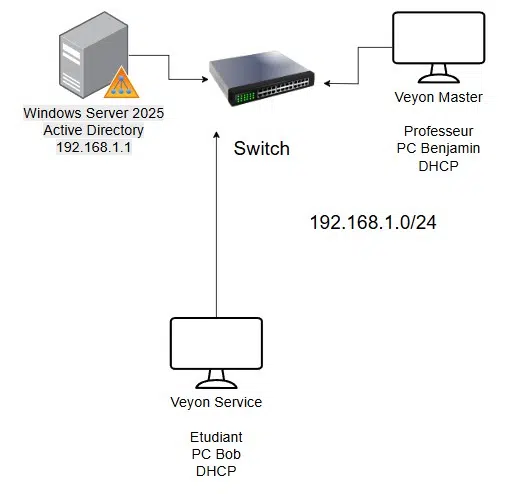 - 1 VM Windows serveur 2025 avec Active Directory pour effectuer l’intégration LDAP avec Veyon (optionnel).