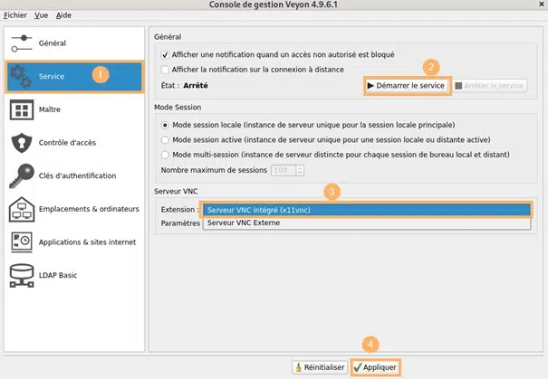 Dans l’onglet « Service », cliquez sur « Démarrer le service », puis dans la section « Extension du serveur VNC », sélectionnez « Serveur VNC intégré (x11vnc) ».