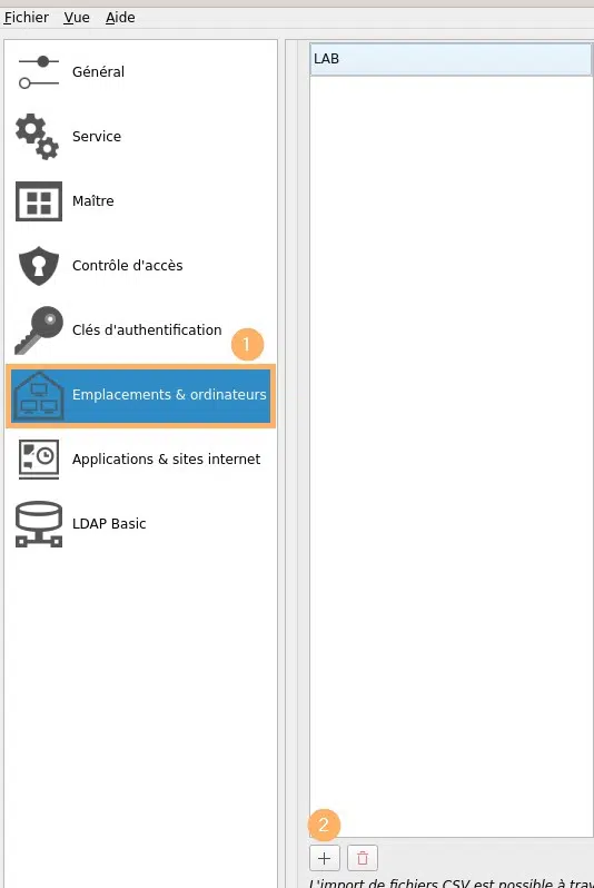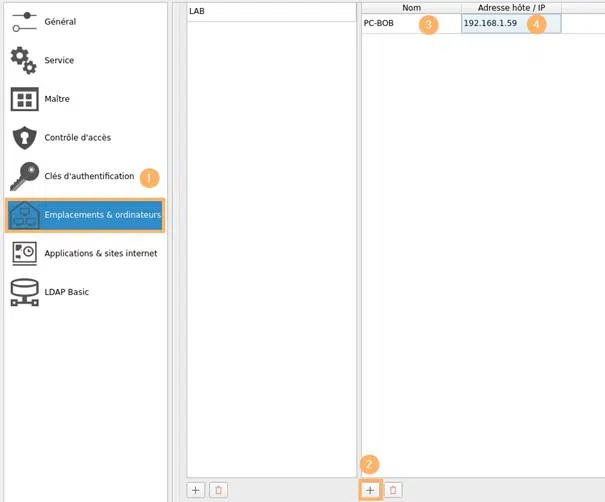 Pour en créer, cliquez dans l’onglet « Emplacement & ordinateurs » puis sur le bouton « + » en bas de la page.