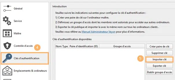 – Il faut donc indiquer au Veyon Service qu’il faut utiliser une authentification par clé et importer la clé publique du ou des Veyon Master dans les PC clients (partie IV du tutoriel).