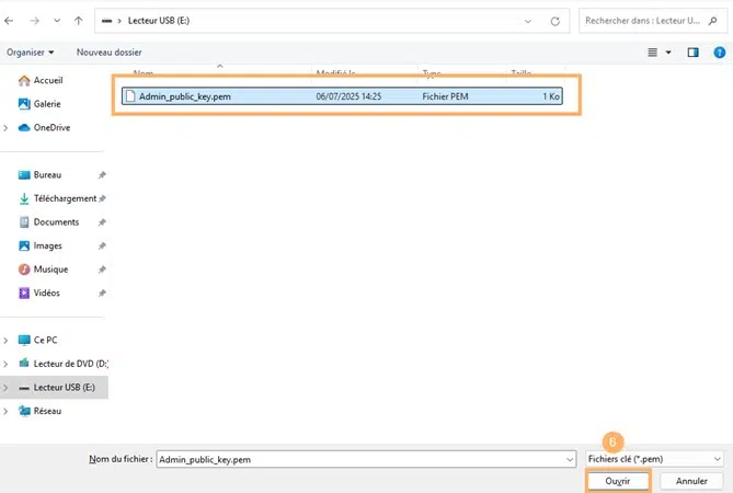Rendez-vous dans le répertoire ou sur le support (clé USB, partage réseau…) où se trouve la clé publique, puis sélectionnez le fichier .pem et cliquez sur Ouvrir.