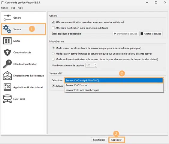 L’onglet « Service » permet de démarrer le service Veyon sur le serveur, mais surtout de sélectionner l’extension VNC qui sera utilisée pour permettre la visualisation à distance des écrans des postes clients.