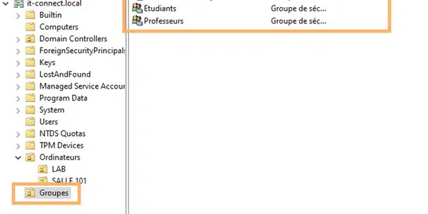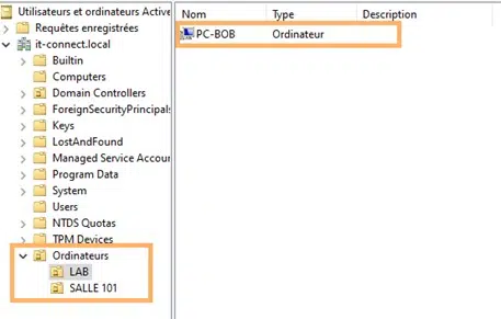 Afin que les salles soient visibles dans Veyon, il est nécessaire de créer des OU dédiées et d’y placer les ordinateurs correspondants. Par exemple, le poste PC-BOB est rattaché à l’OU Lab, représentant la salle de laboratoire.