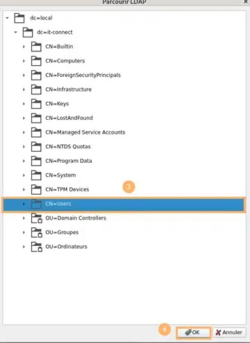 Attention : lorsque vous sélectionnez un conteneur ou une OU, si Veyon affiche par exemple CN=Users, DC=it-connect, DC=local. Dans ce cas, supprimez la partie Base DN fixe (DC=it-connect, DC=local) et conservez uniquement CN=Users, sans quoi des erreurs apparaîtront.